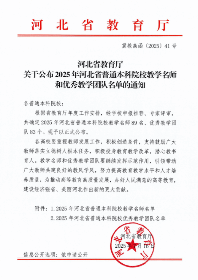 近日,河北省教育厅公布了《关于公布2025年河北省普通本科院校教学名师和优秀教学团队名单的通知》(冀教高函〔2025〕41号)。我校机械设计制造及其自动化专业教学团队获评“河北省普通本科院校优秀教学团队”,机械工程系副主任石岩教授获批“河北省普通本科院校教学名师”。该教学团队现有成员16人,其中教授3人、副教授4人,硕博学位教师占比100%。团队承担机械设计制造及其自动化等3个专业近20门核心课程教学任务,在产教融合方面与诚铸机械、...
