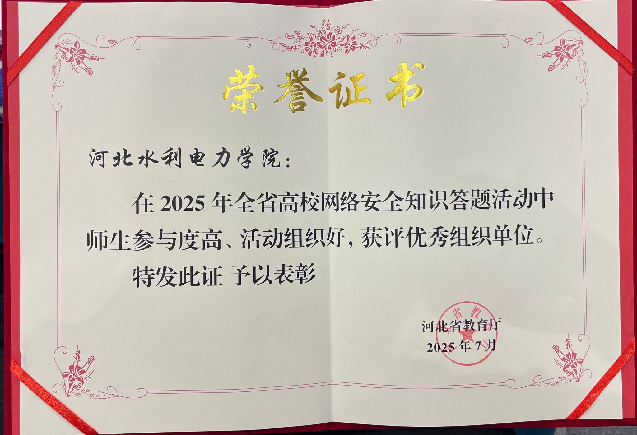 7月16日,在河北省教育厅举办的全省教育系统网络安全学术研讨班开班式上,我校凭借在网络安全知识答题活动中的出色表现,荣获“优秀组织奖”荣誉。今年5月,接到省教育厅关于开展网络安全知识在线答题活动的通知后,我校迅速响应。在现代教育技术中心的统筹协调下,全校上下形成联动机制:校领导亲自批示部署,各部门通力配合,师生员工积极参与,参与率位居全省高校前列。通过本次活动,系统普及了《网络安全法》《数据安全法》等法律法规知识,...