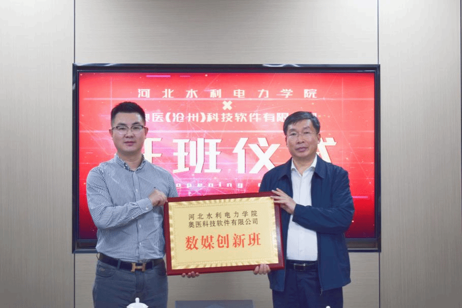 仪式最后,于振海宣布数媒创新班开班,并向奥医(沧州)科技软件有限公司授牌。