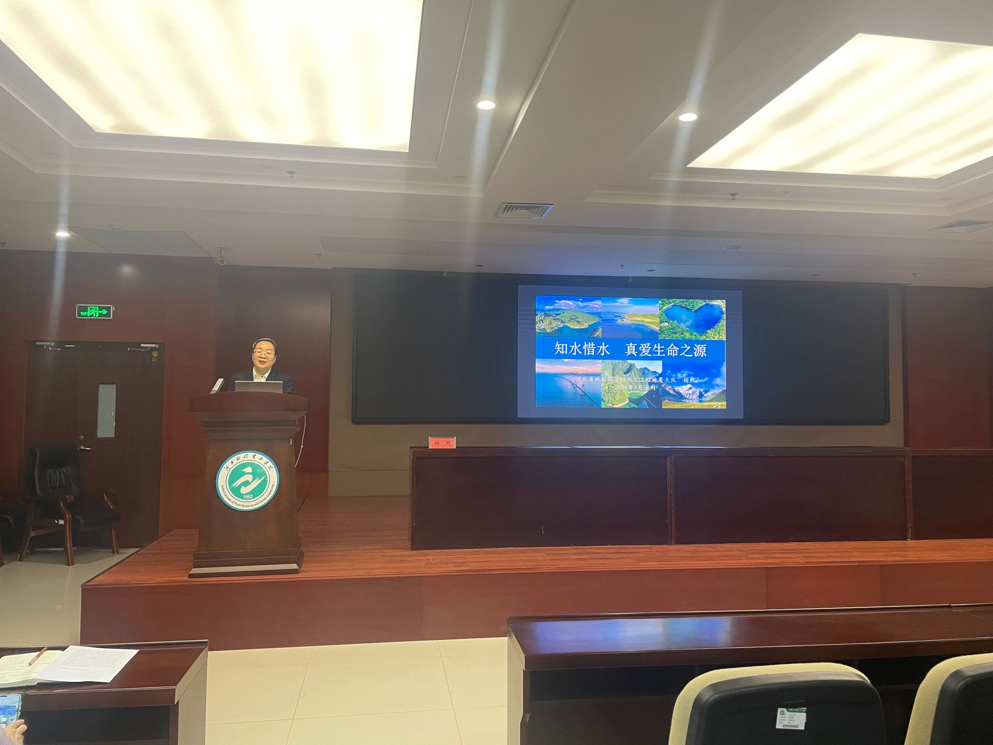 在报告会环节,河北省地矿局第四水文工程地质大队高级工程师杨熙以“知水惜水,真爱生命之源”为主题,从水资源的本质到水资源对人类的影响展开,强调水资源是极其重要的基础性自然资源,是维系经济社会发展和国家生态安全的重要战略资源。报告过程中,杨熙高工与学生进行了互问互答,现场氛围非常活跃。最后她以“士不可以不弘毅,任重而道远”为结尾,鼓励学生努力学习专业文化知识,知水爱水节水!