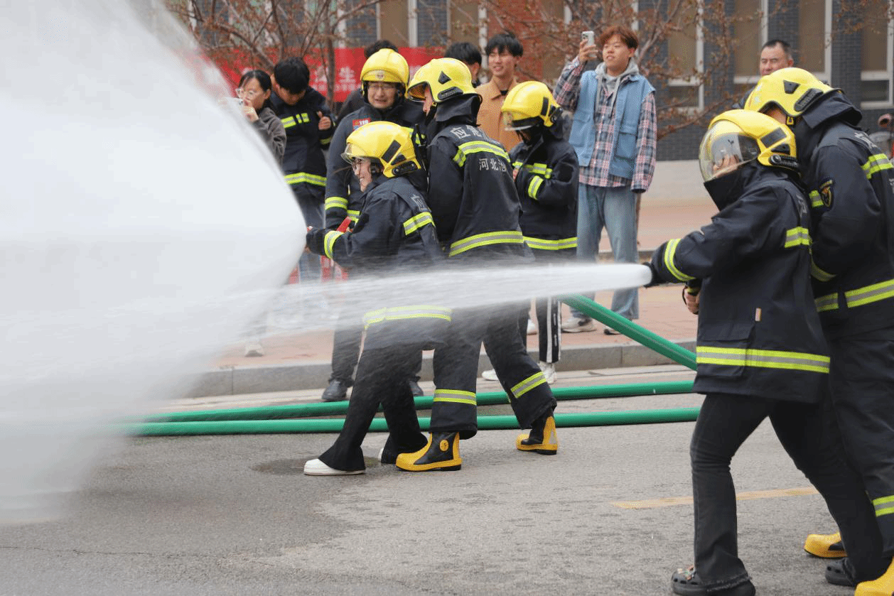 最后,赵江奎为大家讲解了室内消火栓的使用方法,消防员们手把手教师生员工使用消防车高压水枪灭火,让师生员工当了一回“消防员”。