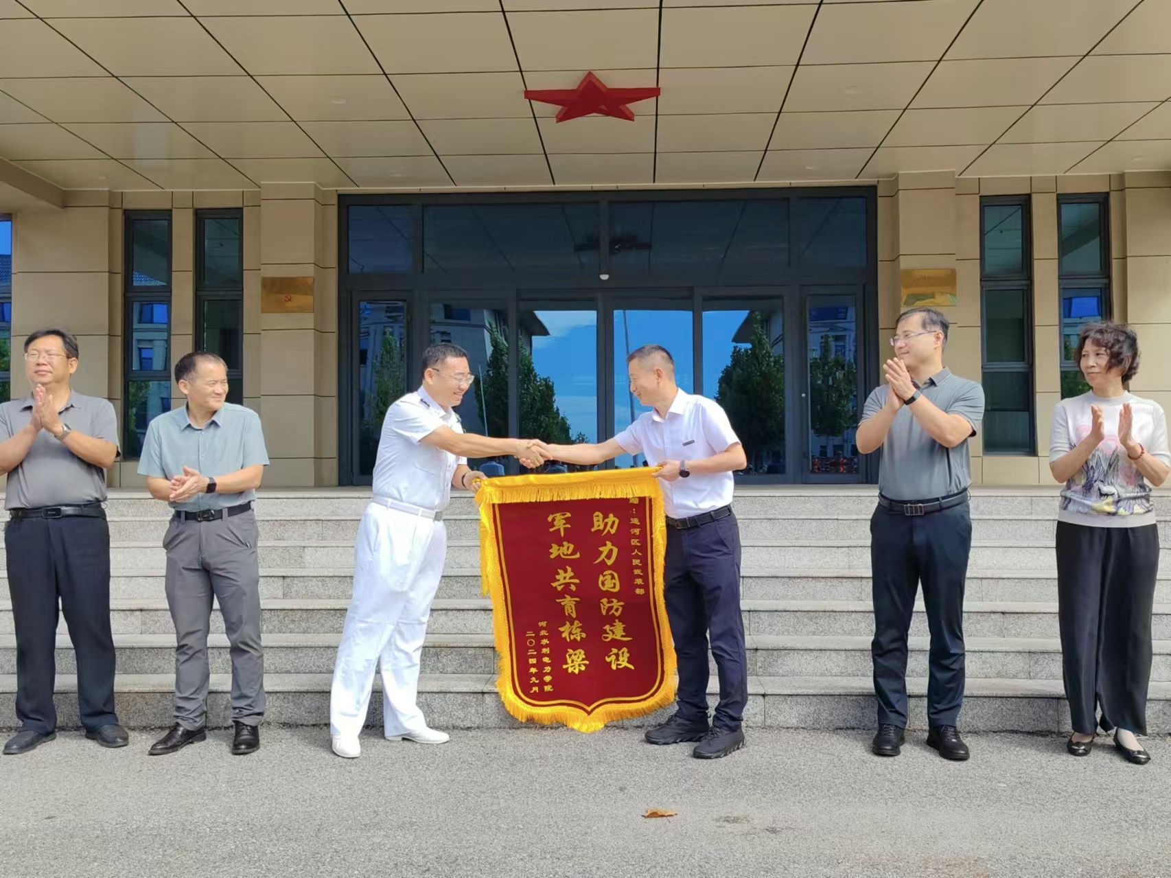 王滨校长向运河区人民武装部赠送了锦旗和慰问品,感谢其对我校征兵和国防教育工作的大力支持与帮助,并表示,学校将进一步加强与武装部的沟通合作,为国家一流军队建设不断输送高素质人才。