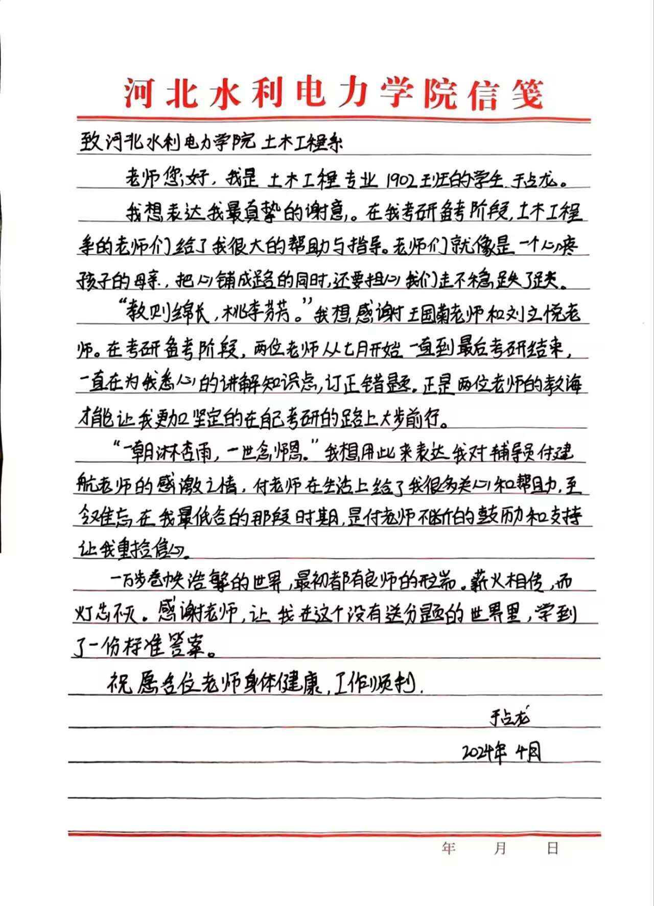 光阴流转,授业之恩难忘。于占龙亲笔书写的感谢信,简短的话语中饱含着他对学校的真挚情感。近年来,土木工程系秉承“勤奋、求是、创新、笃行”的校训精神,在育人工作中屡结硕果,学生考研升学率逐年递增,有多人以优异的成绩考入985、211重点大学深造。已就业的毕业生在工作中兢兢业业、作风朴实,适应岗位快、专业素养高、创新意识强,得到就业单位一致好评,充分展现出了水院学子的优秀风采。